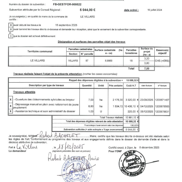 la commune de Le Villars a sollicité et obtenu du Conseil régional de Bourgogne Franche-Comté réuni en commission permanente le 16/07/2024, une subvention d’investissement de 5 044 €, afin de réaliser des travaux de dépressage dans des peuplements feuillus de sa forêt, en parcelle 18, sur une surface totale de 7,00 hectares.